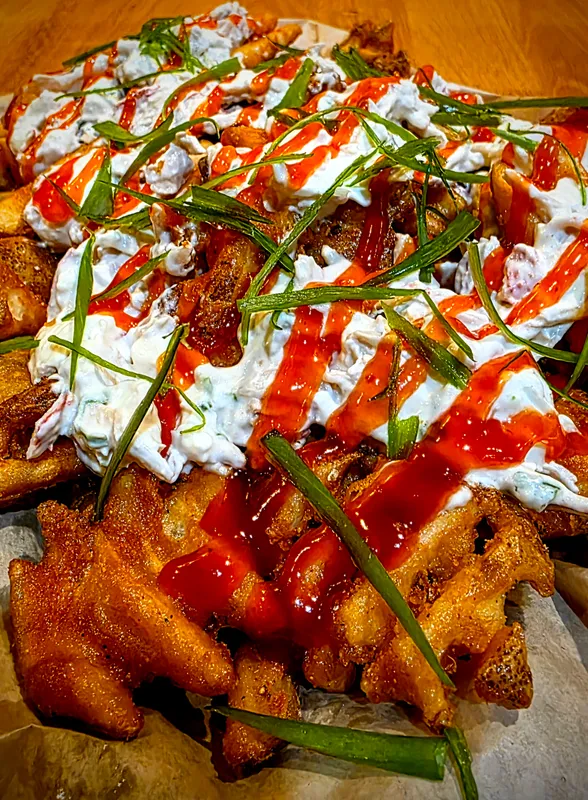 Crispy waffle cut fries topped with rangoon fillings and drizzled with our Woo Tang Sauce