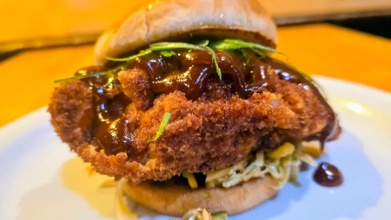 Tonkatsu sauce, fried katsu chicken sandwich, Asian Slaw served with a side of Pickled Korean Cucumbers