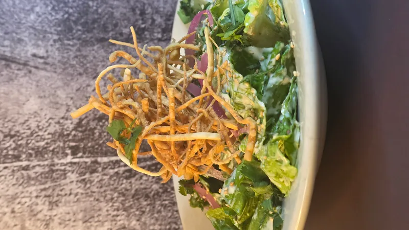 Mixed greens, parmesan, toasted sesame seeds, pickled onion, wonton croutons with Caesar dressing